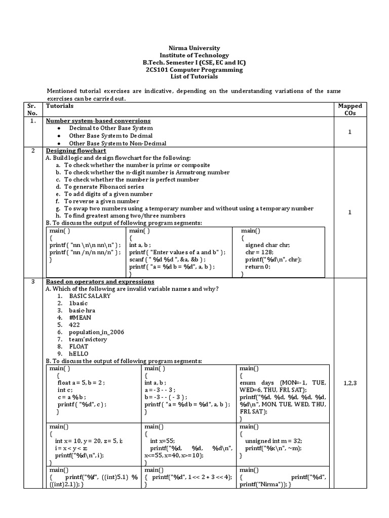 2CS101 Detailed List of Tutorials | PDF | Teaching Methods & Materials