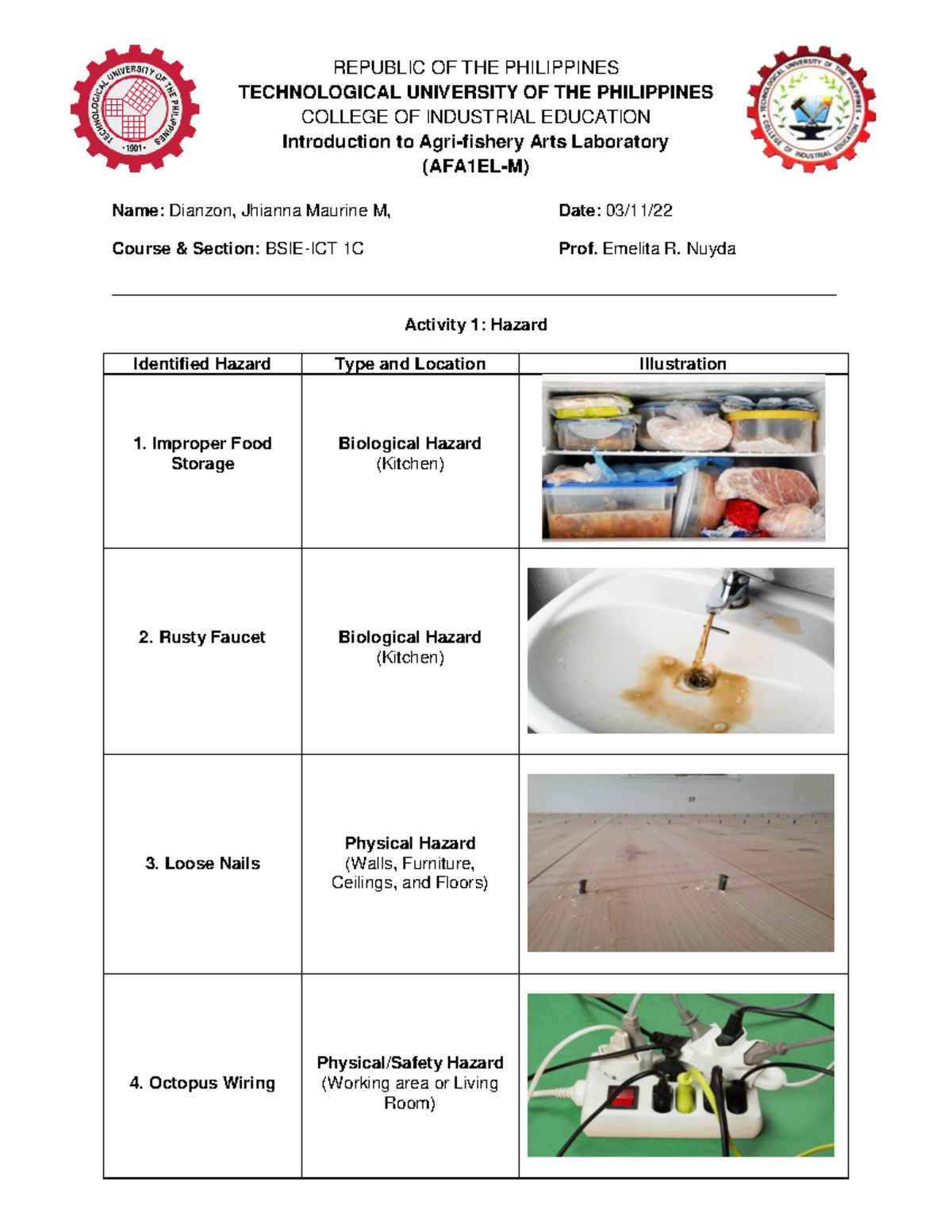 Activity 1 Hazard - TECHNOLOGICAL UNIVERSITY OF THE PHILIPPINES COLLEGE ...