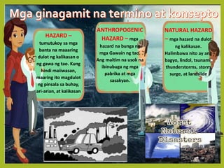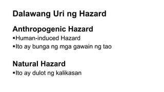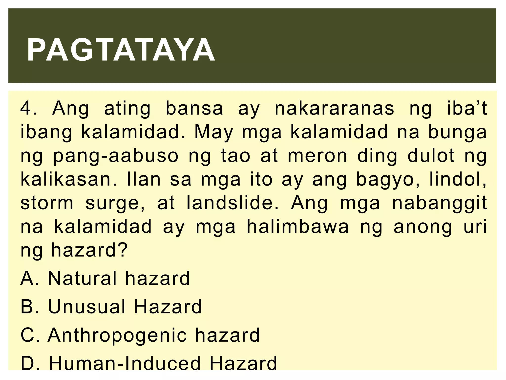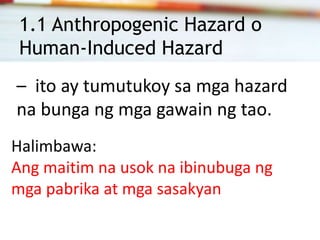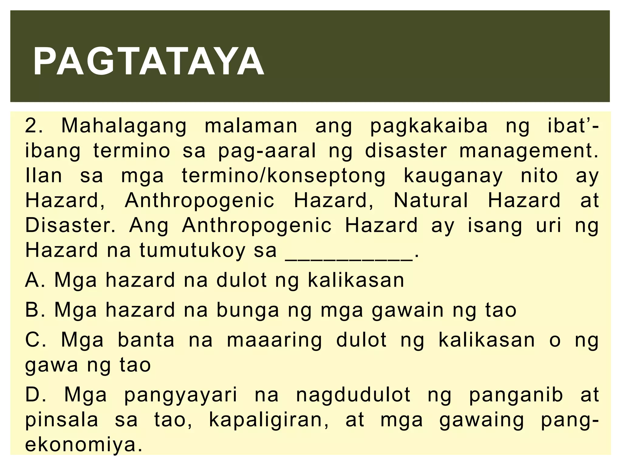 Anong uri ng Hazard na bunga ng mga gawainng tao? A. Anthropogenic ...