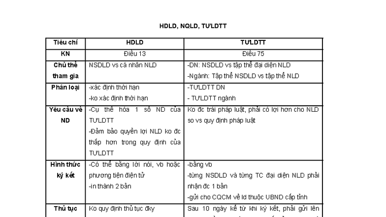 HDLD, NQLD, TƯLDTT: Bảng So Sánh Tiêu Chí và Quy Định - Studocu