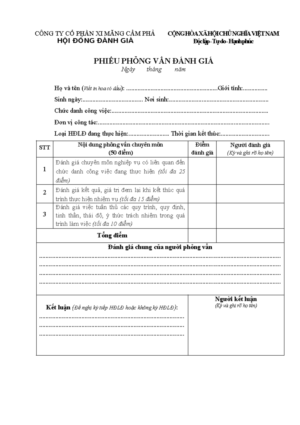 BM.05 Phieu phong van danh gia HDLD - CÔNG TY CỔ PHẦN XI MĂNG CẨM PHẢ ...