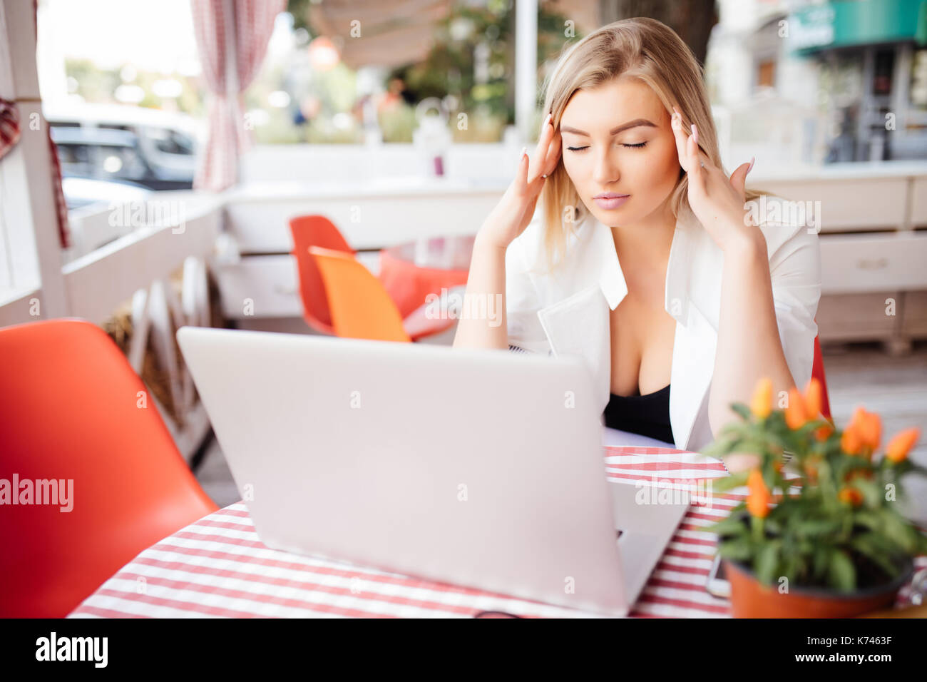 Young business woman sitting with a headache on laptop Stock Photo ...