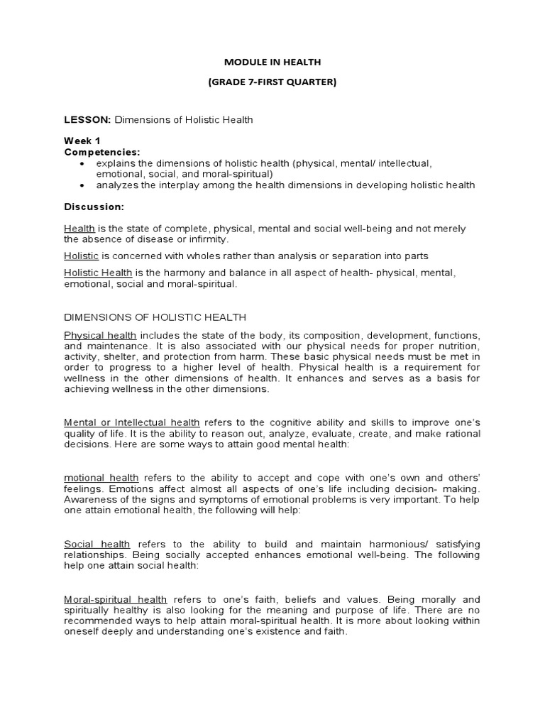 LESSON: Dimensions of Holistic Health Week 1 Competencies:: Module in ...
