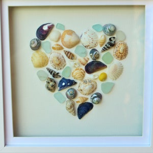 Sea Glass and Sea Shell Heart Art Framed in a White Wooden Shadow Box ...
