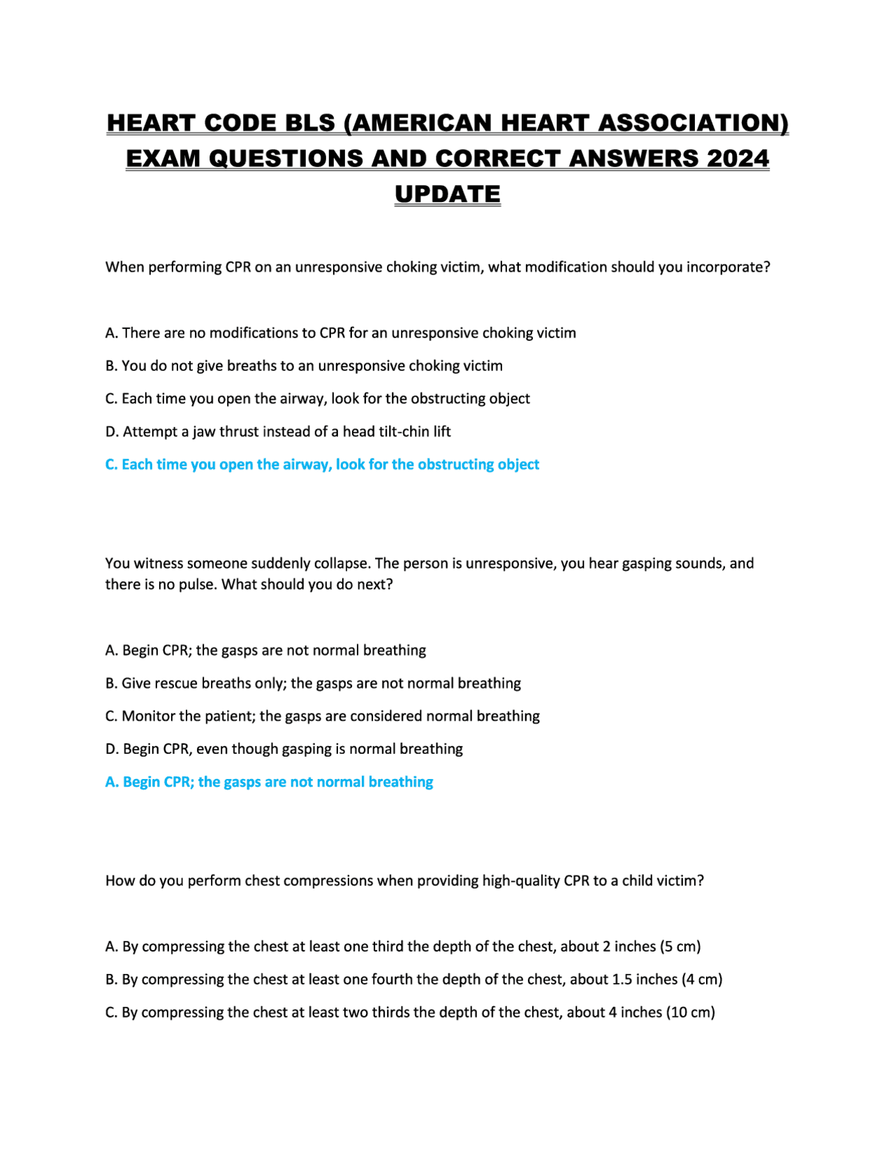 Bundle For Heart Code BLS Exam Questions with Correct Answers - Stuvia US