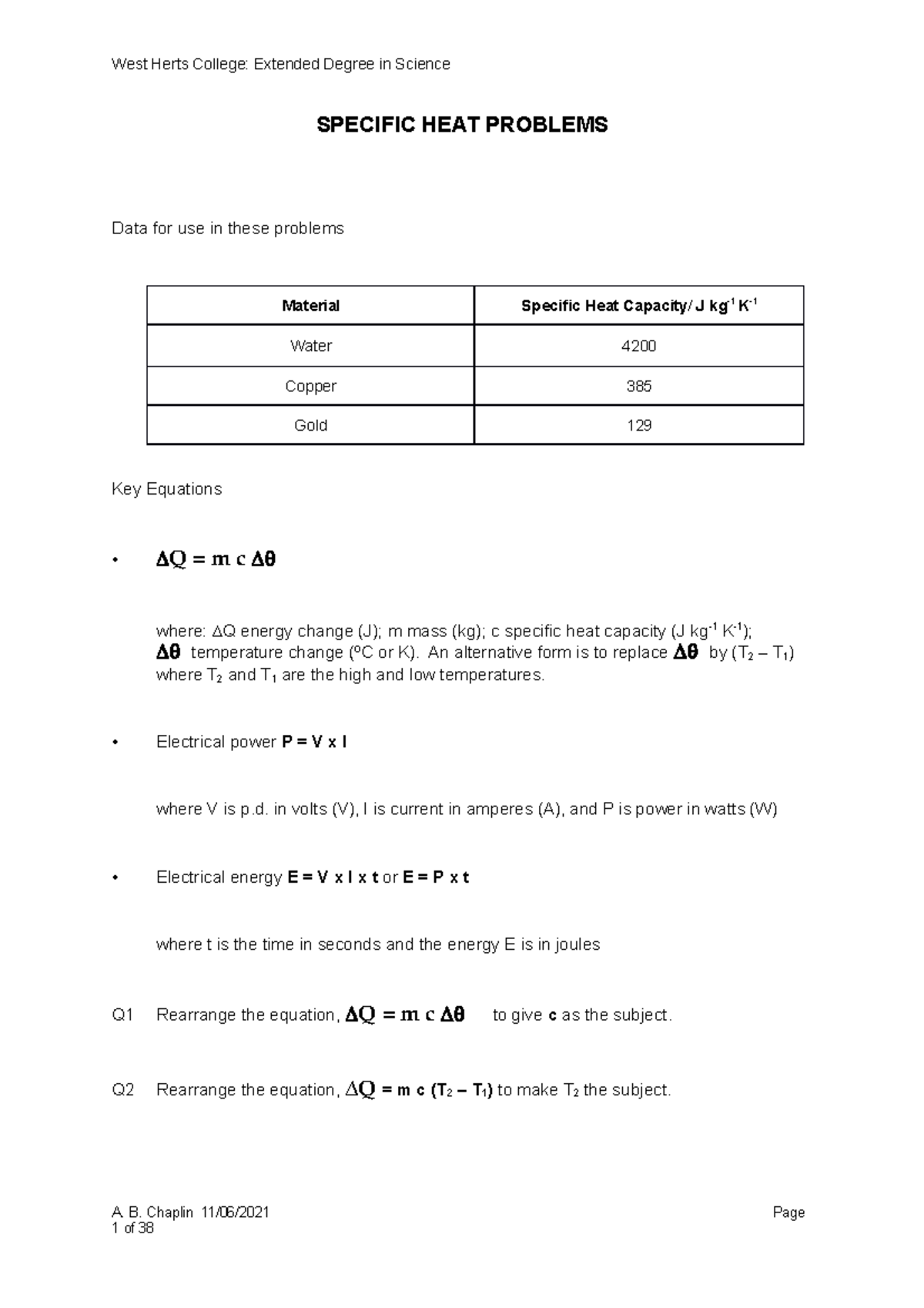 Notes in Thermodynamics Worksheet 1 - Specific heat capacity and Latent ...