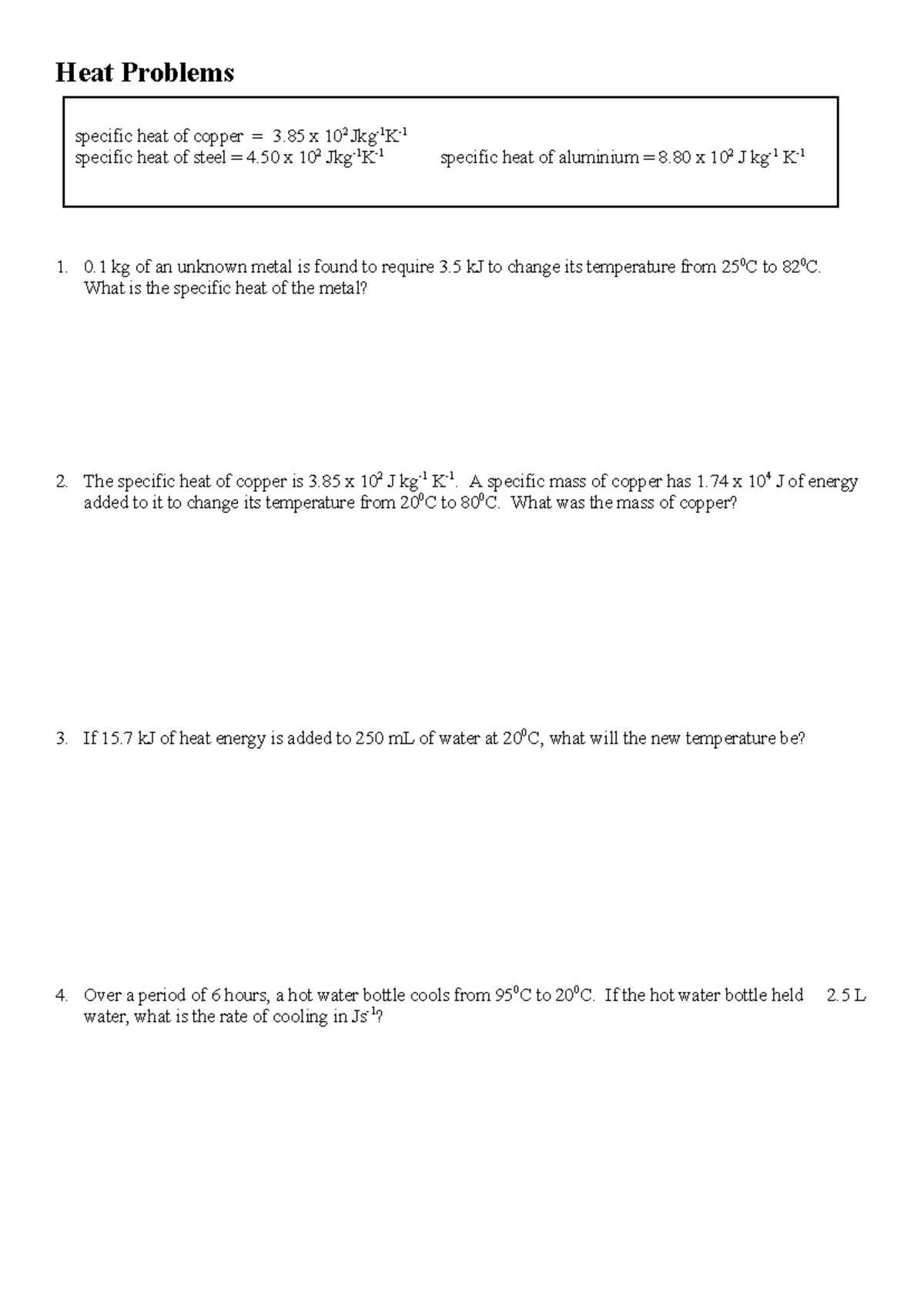 Heat Problems Worksheet: Chemistry Exercises