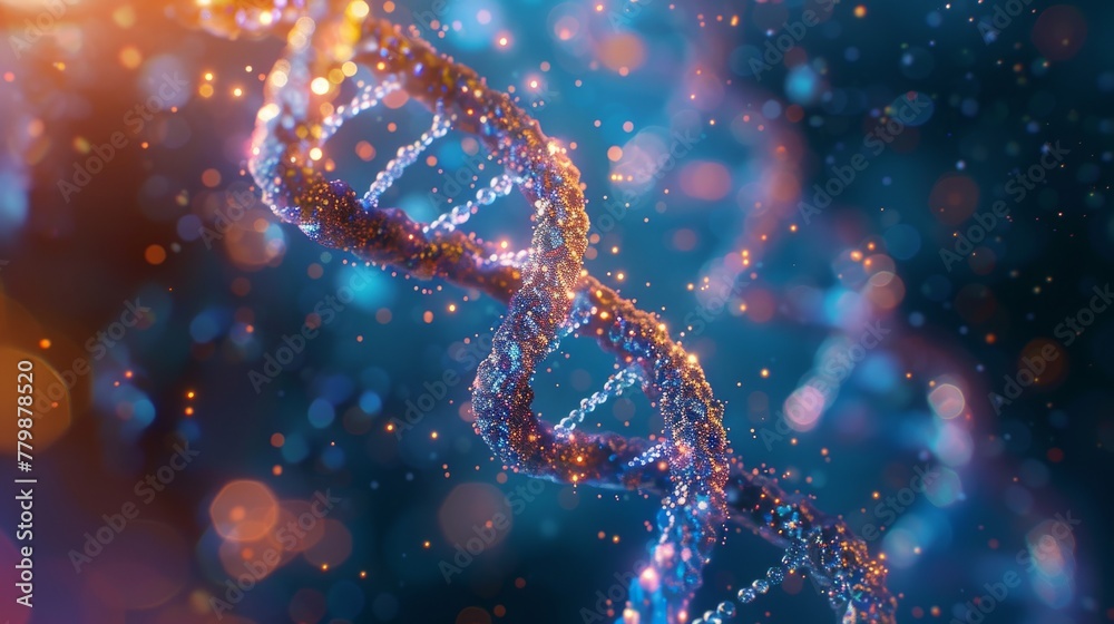This visual artwork showcases a vibrant DNA double helix made of ...