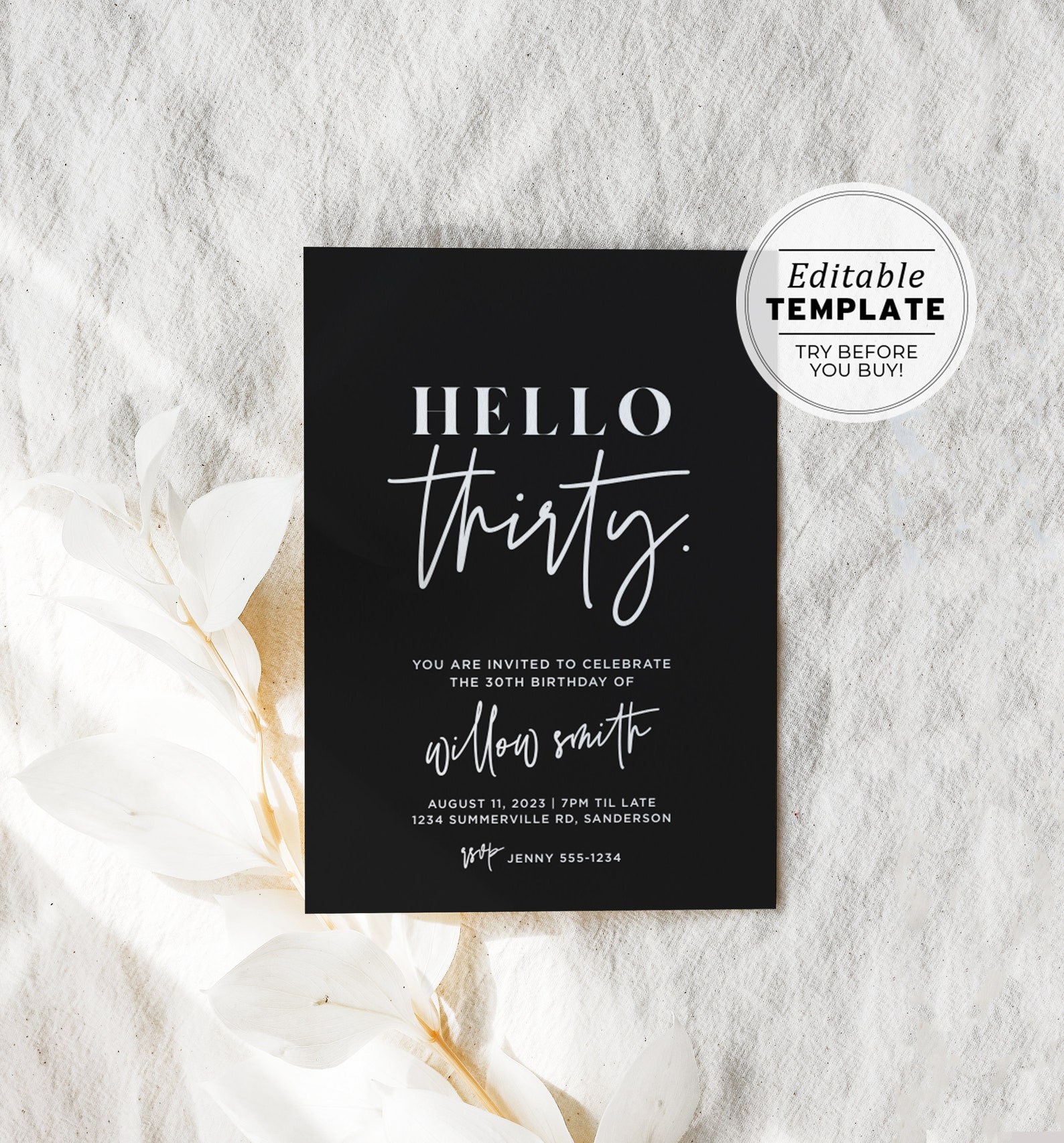 Hello Thirty 30th Birthday Invitation, Editable Any Age Invite, Black ...