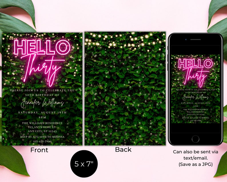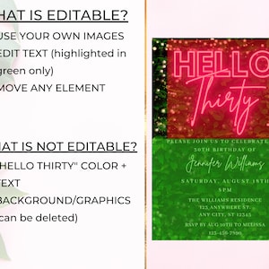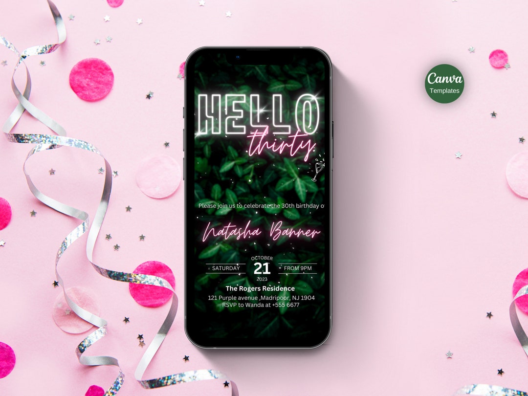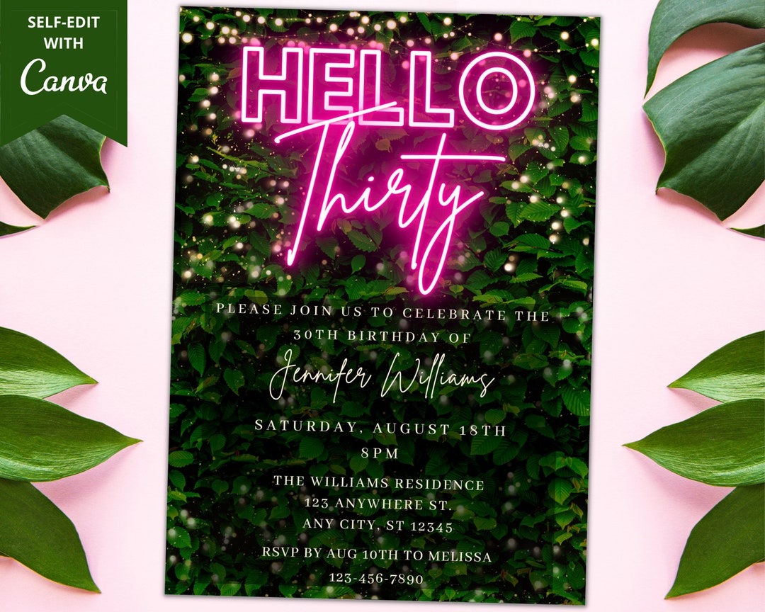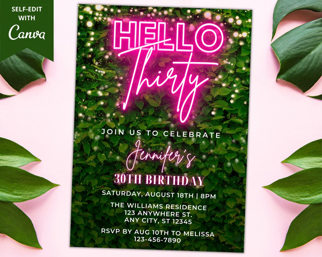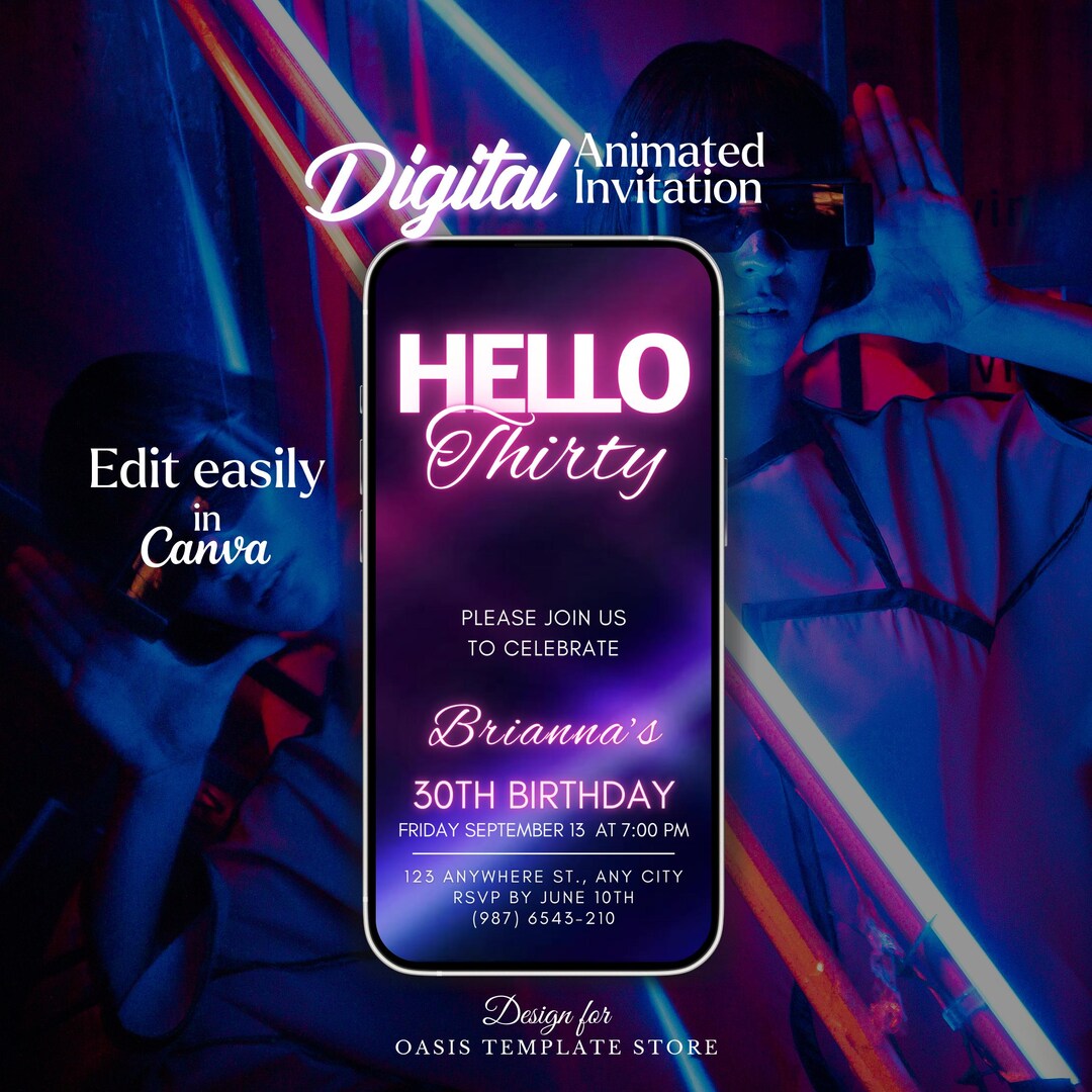 Hello Thirty Birthday Party Invitation Template, 30th Editable, Neon ...