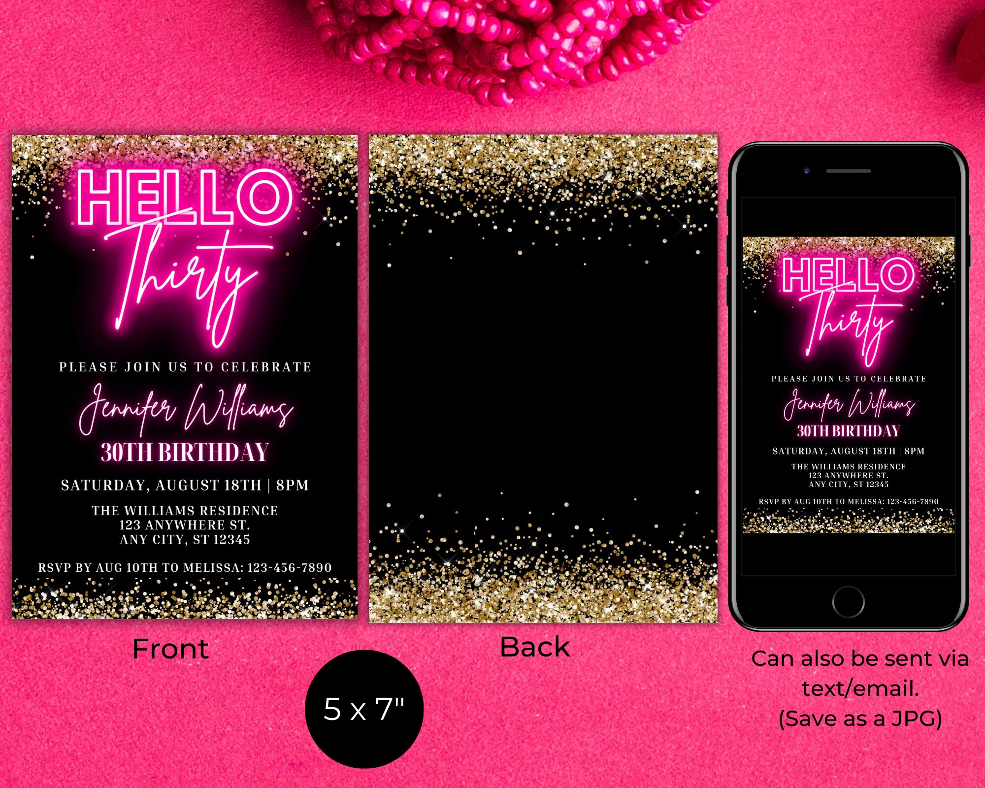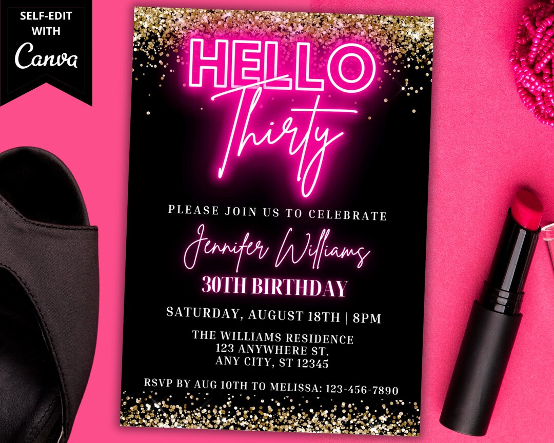 Editable Hello Thirty 30th Birthday Pink Neon Gold Glitter Party ...