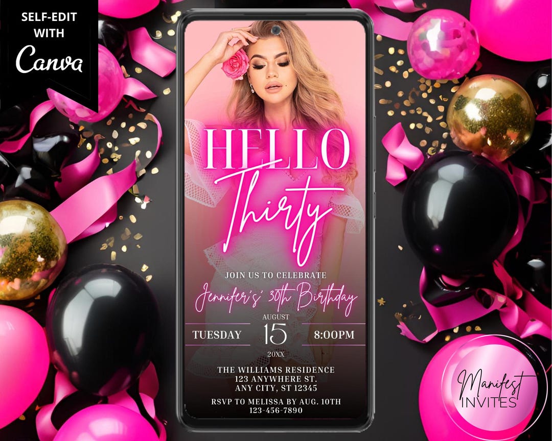 Hello Thirty Birthday Invitation, Pink Neon Digital Invitation, Video ...