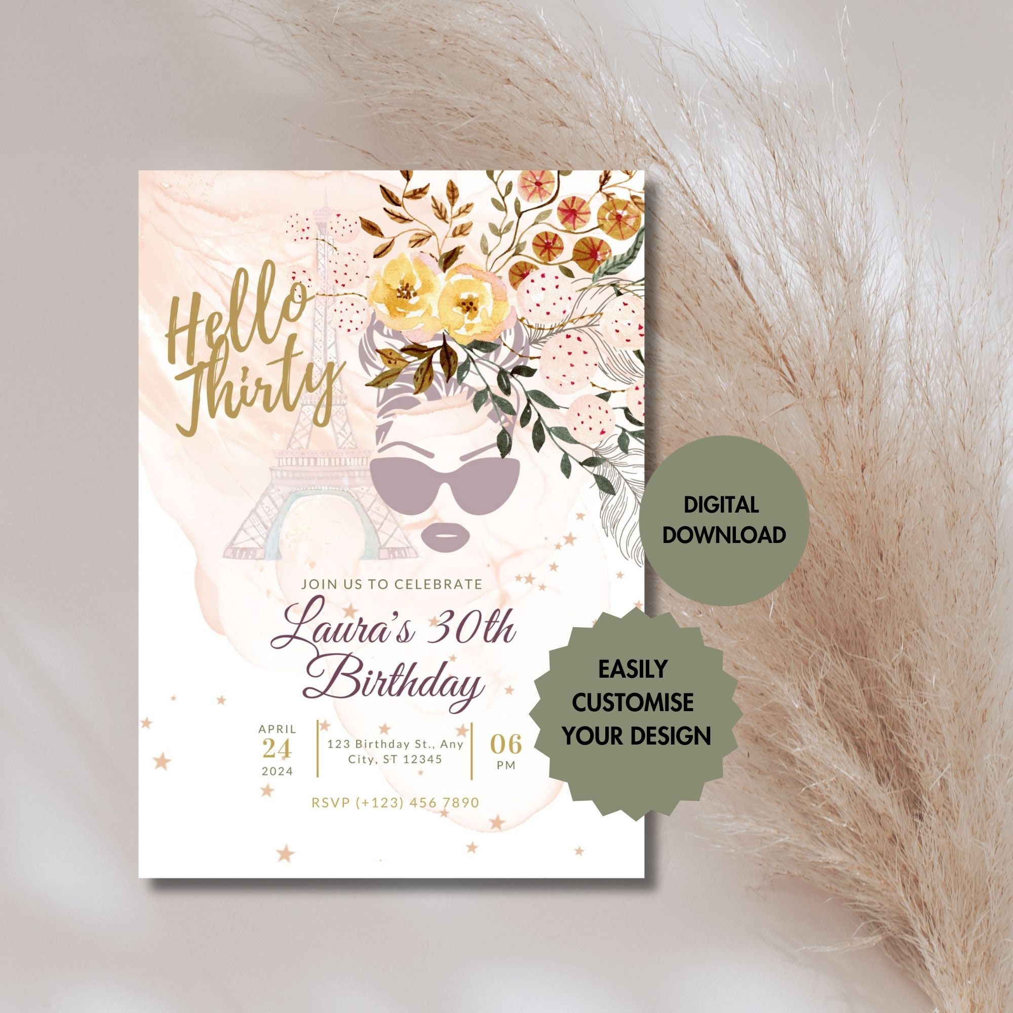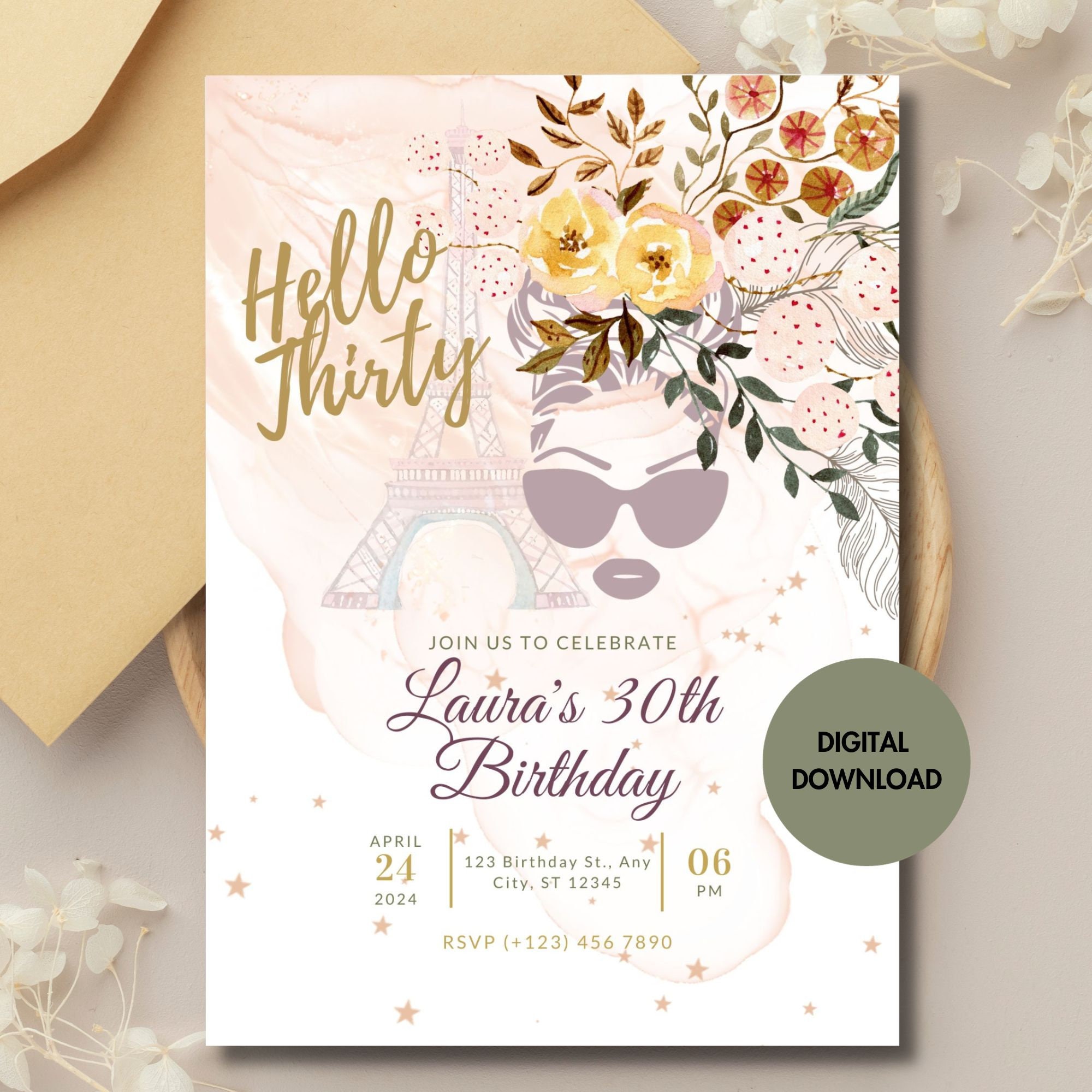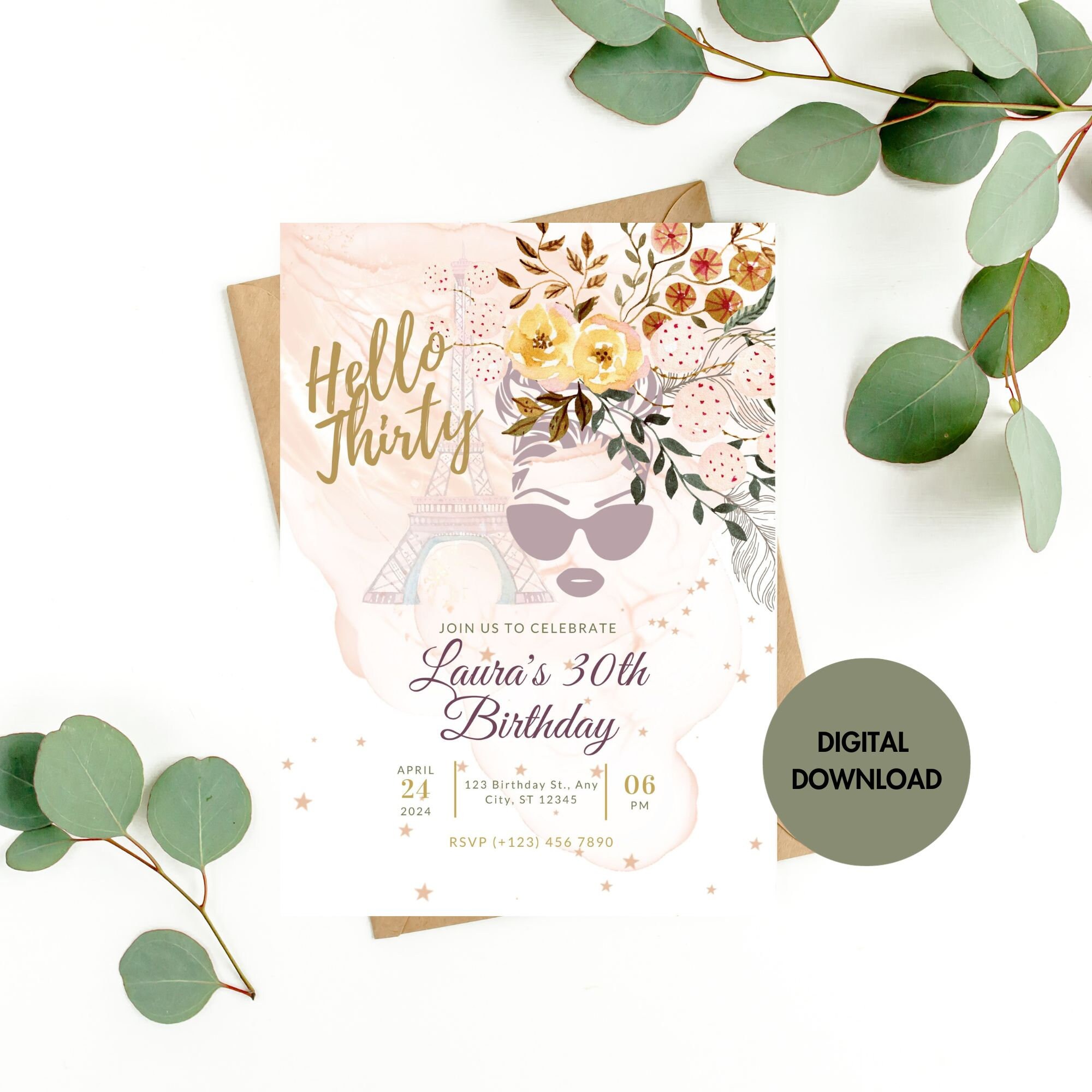 Editable Hello Thirty Birthday Invitation Glamorous Chic Paris 30th ...