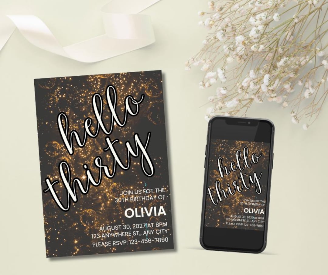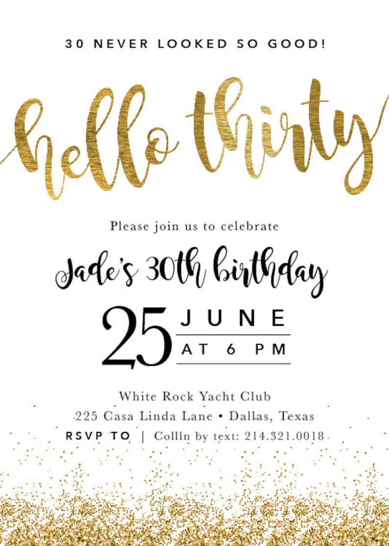 Hello Thirty 30th Birthday Invitation: Gold Glitter, Editable (digital ...