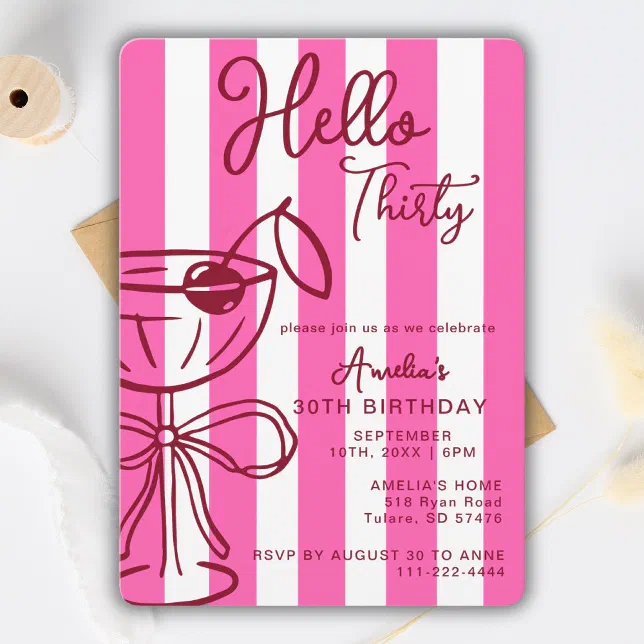 Hello Thirty Coctail 30th Birthday Pink Red Invitation | Zazzle