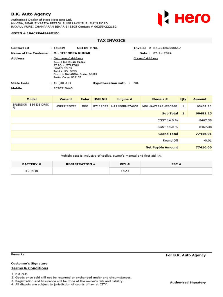 Hero Splendor BS6 Tax Invoice Details | PDF | Motor Vehicle | Car