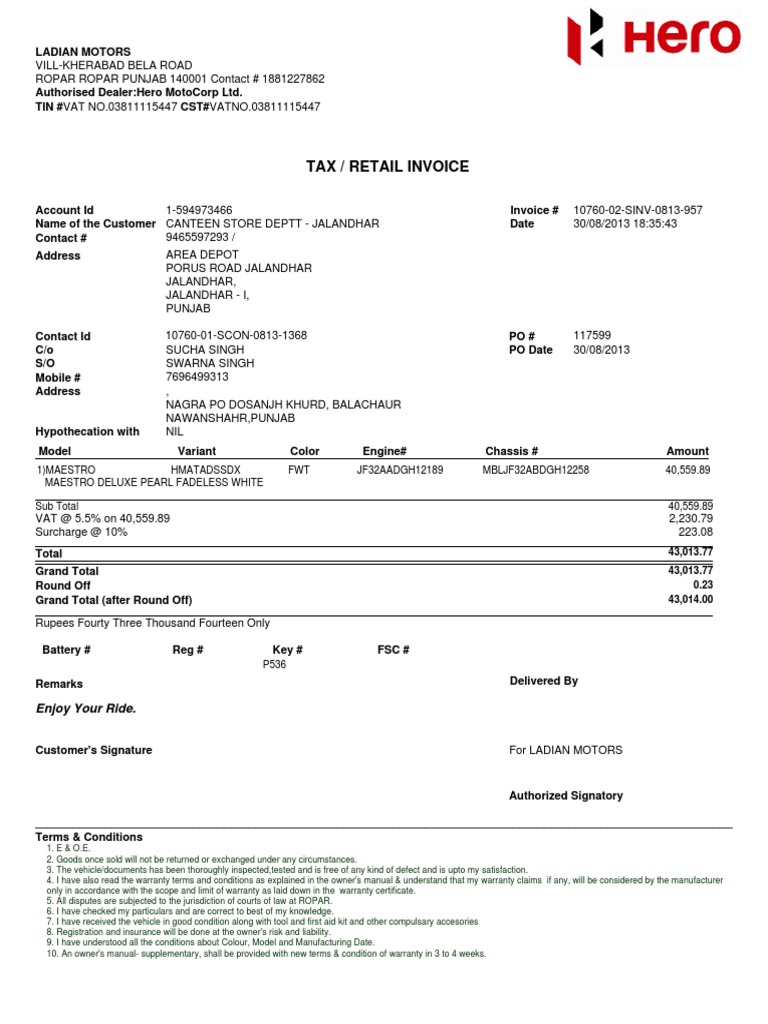 Hero MotoCorp Invoice for Maestro Purchase | PDF