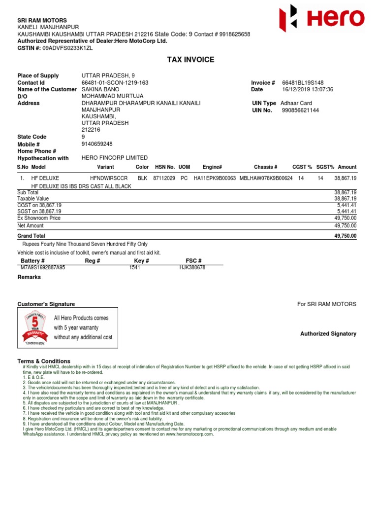 Sri Ram Motors tax invoice for Hero HF Deluxe motorcycle | PDF