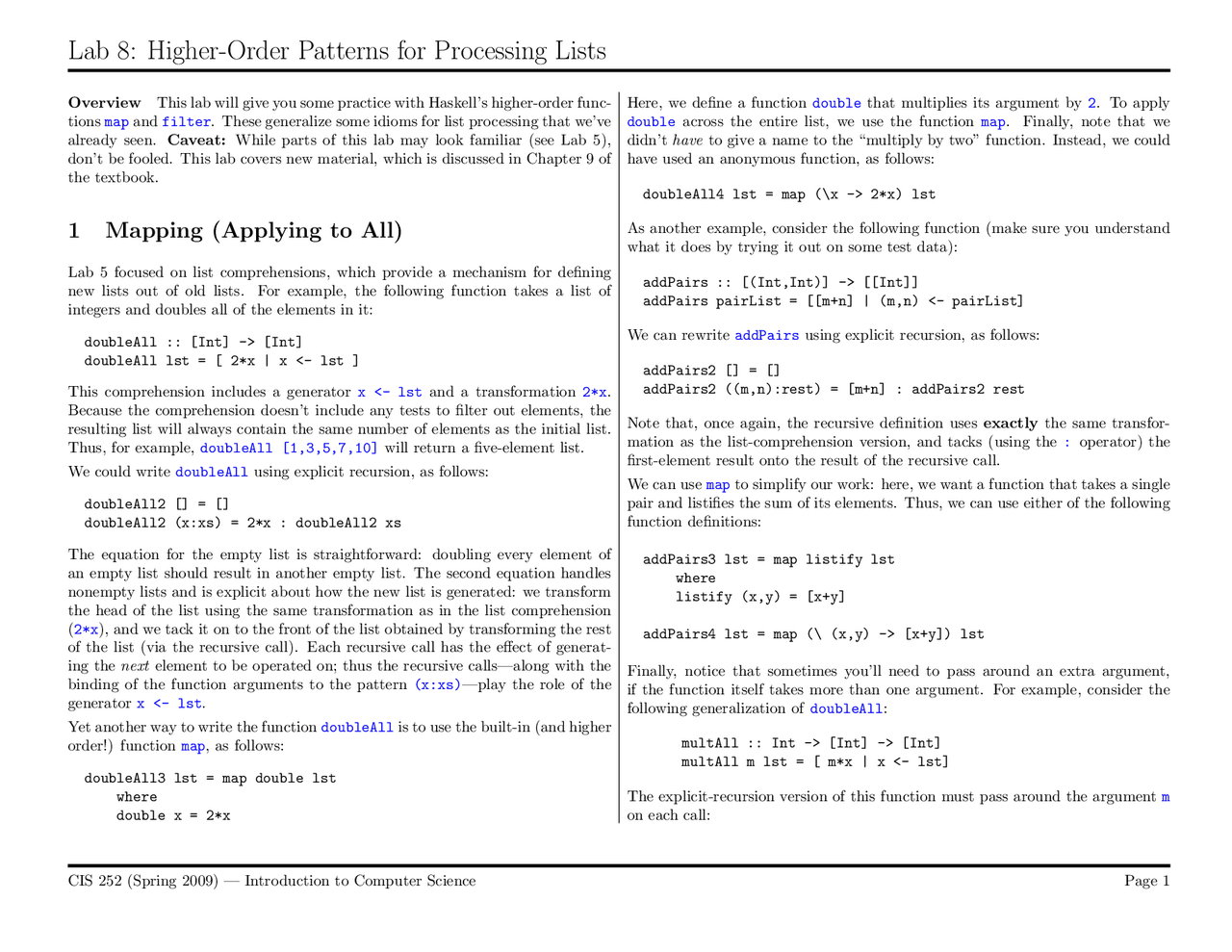 Lab 8: Higher Order Patterns for Processing Lists | CIS 252 - Docsity