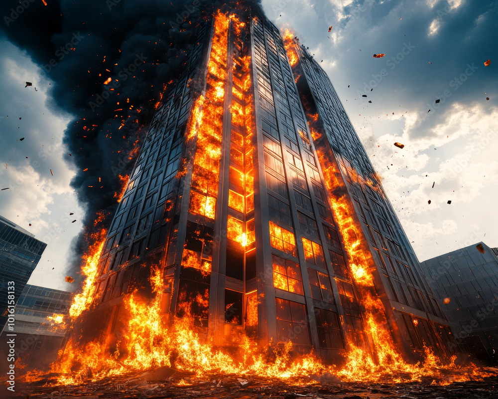 high rise office building engulfed in flames, with fire and smoke ...