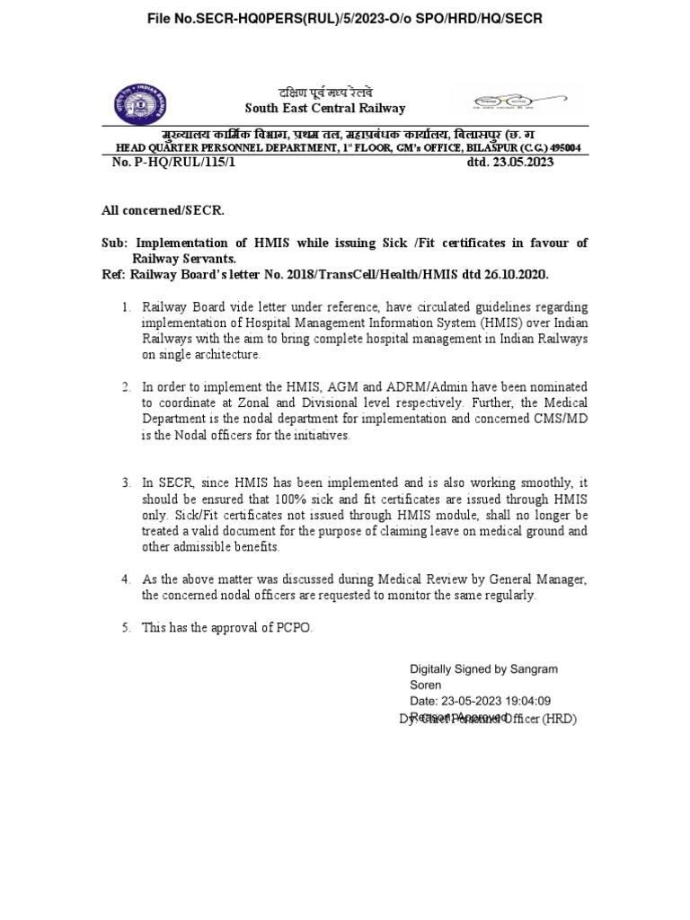 Pan India implementation of HMIS over Indian Railways - Rail Ministry
