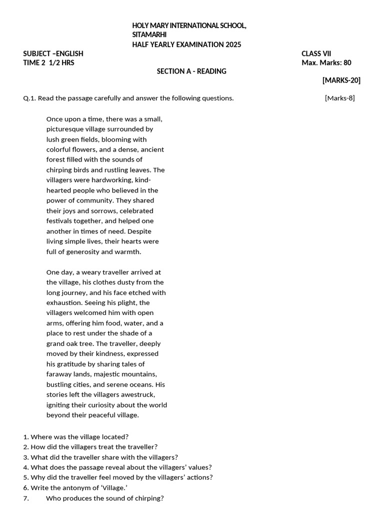 7th English - Half Yearly Question Paper - HMIS | PDF