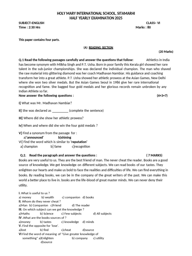 Half Yearly 6th English Question Paper-HMIS | PDF