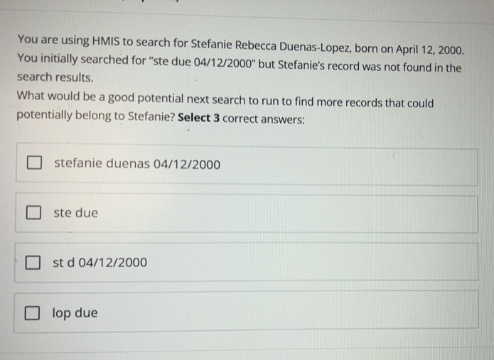 Solved: You are using HMIS to search for Stefanie Rebecca Duenas-Lopez ...