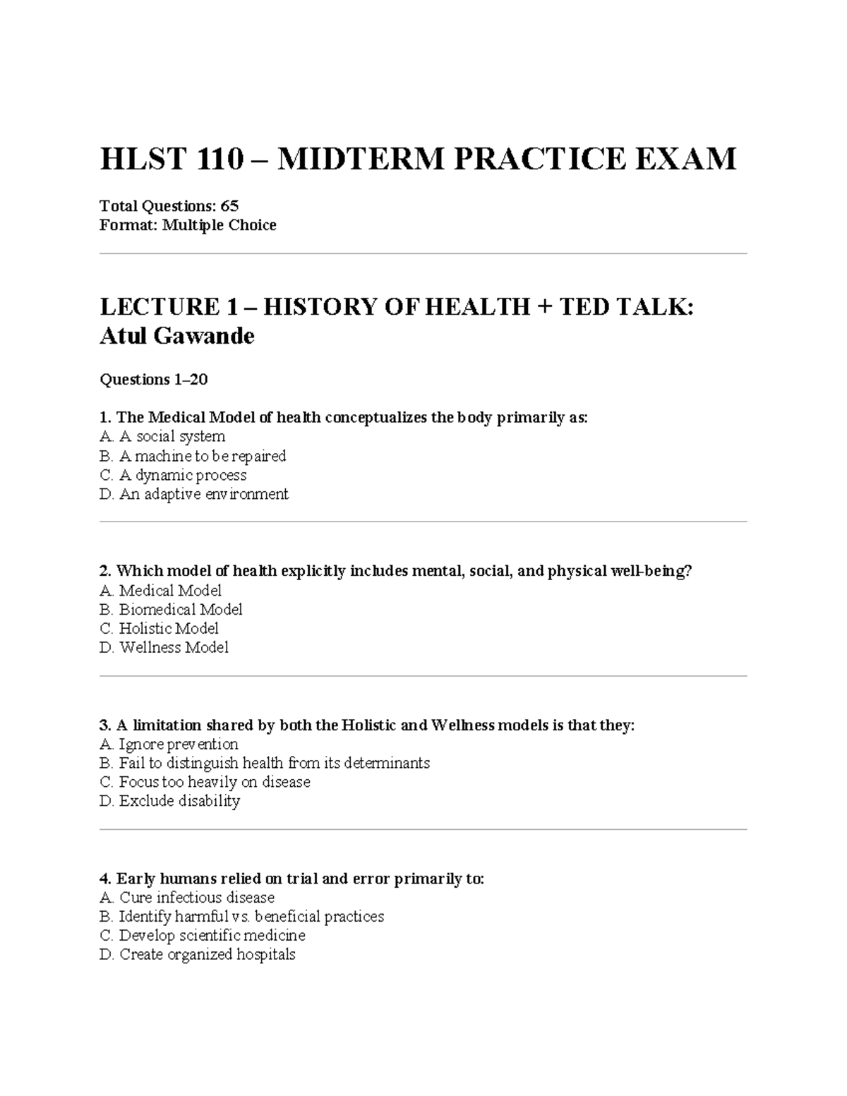 HLST 110 MIDTERM PRACTICE EXAM: Key Concepts & Questions - Studocu