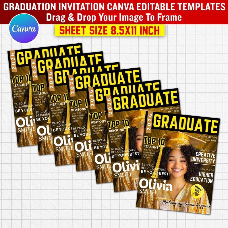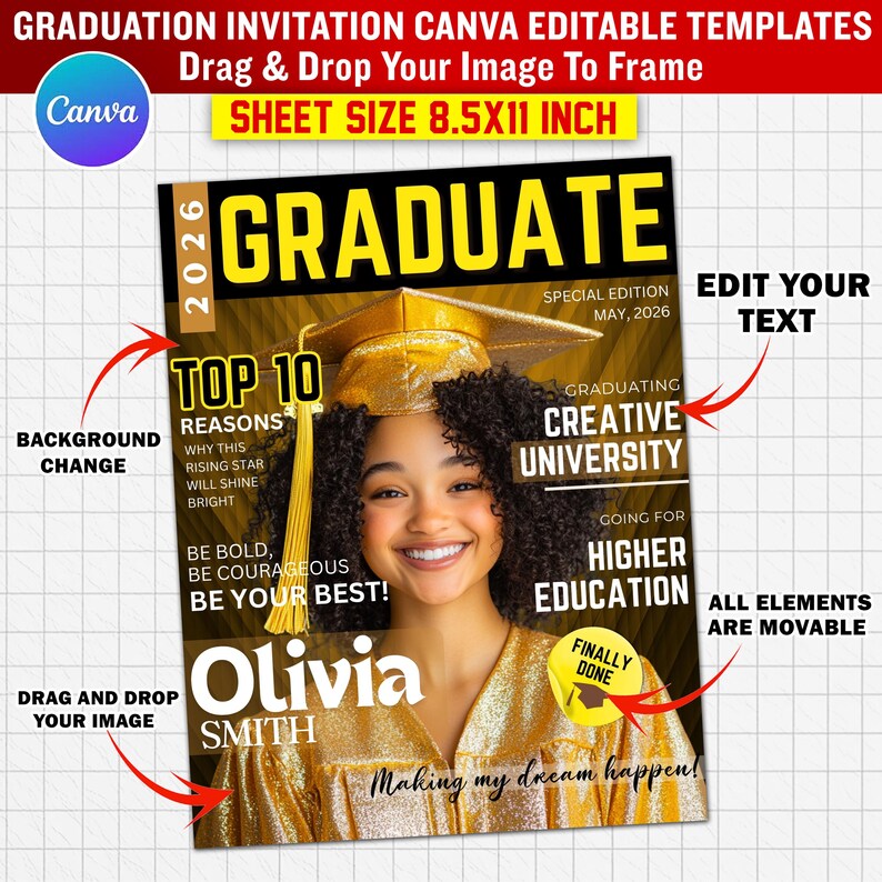 Class of 2026 Yellow Graduation Invitation, Canva Editable Magazine ...