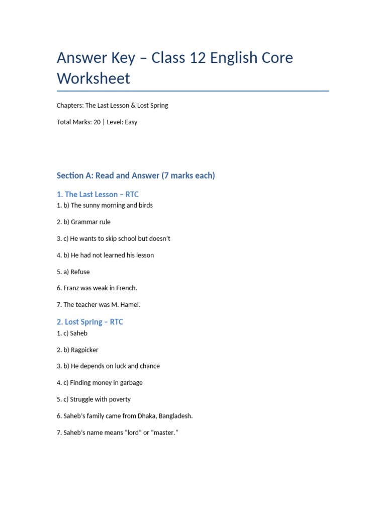 12th Class English Answer Key |12th class english paper checking |12 ...