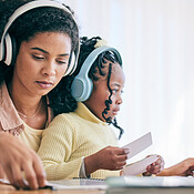 Headphones, elearning and girl with mother and homework flash cards for ...
