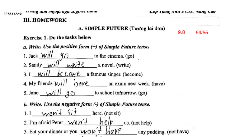 CTREE LAND Tiếng Anh 4 CLC: Simple & Near Future Homework - Studocu