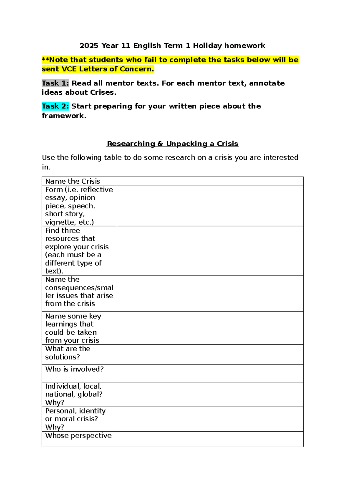 2025 Year 11 English Term 1 Holiday Homework Tasks and Guidelines - Studocu