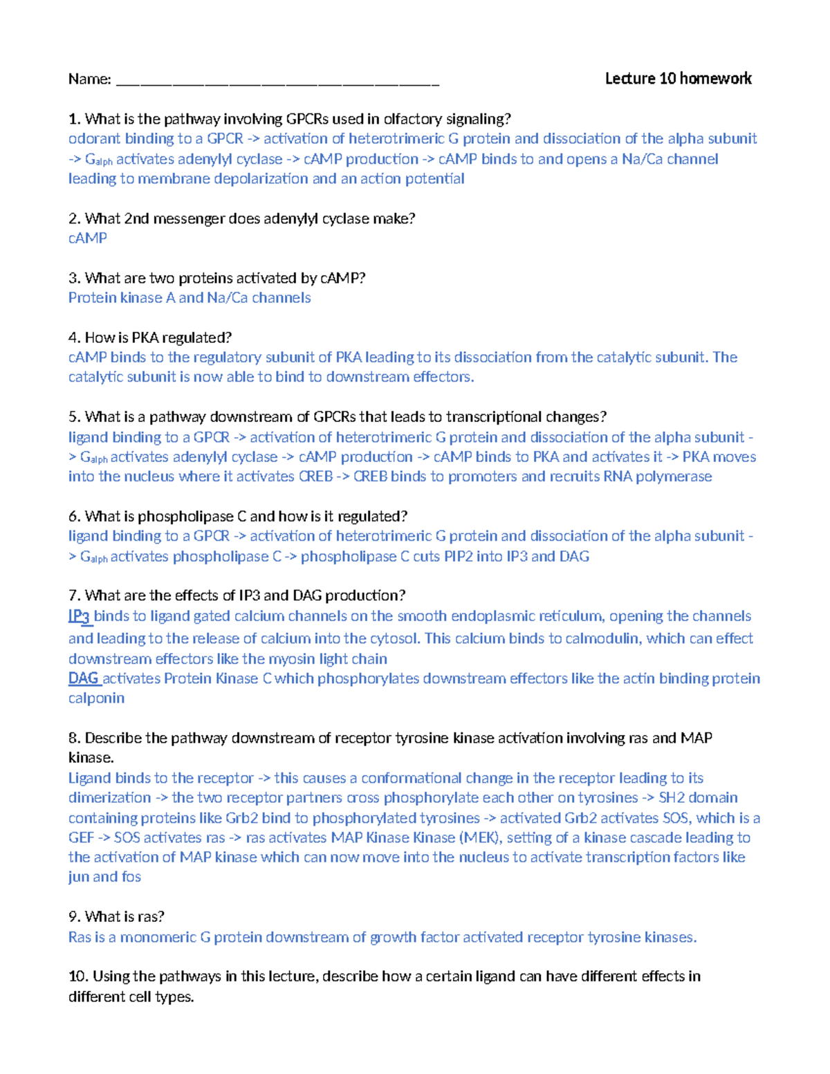 Lecture 10 Homework Key: GPCR Pathways in Olfactory Signaling - Studocu