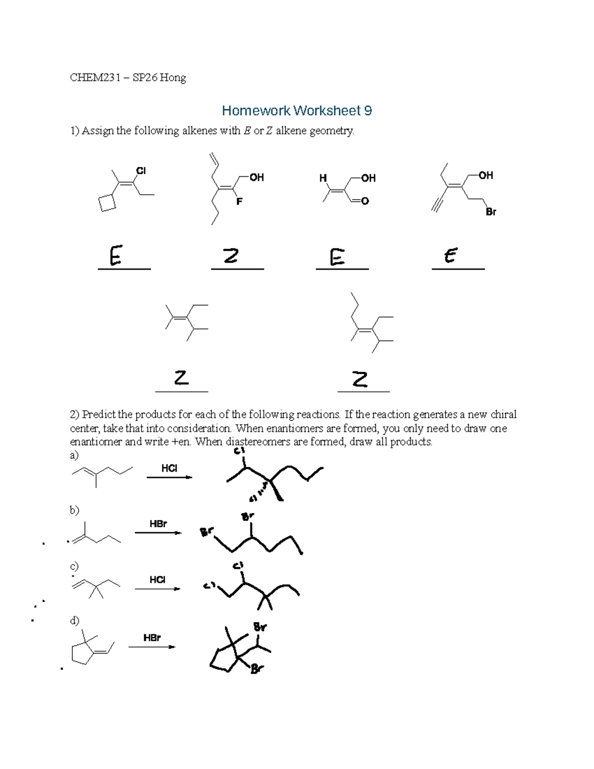 CHEM231 SP26 Homework Worksheet 9: Alkenes & Reaction Mechanisms - Studocu