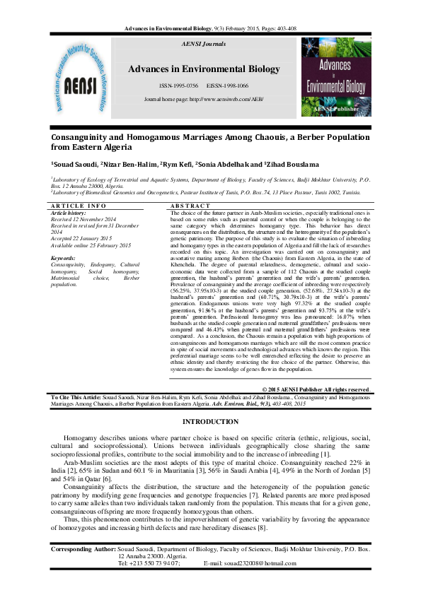 (PDF) Consanguinity and Homogamous Marriages Among Chaouis, a Berber ...