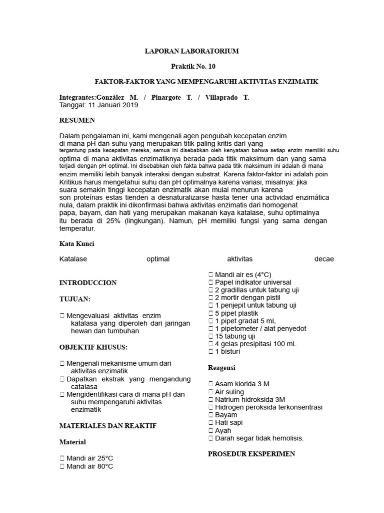Laporan Laboratorium 10 Faktor Yang Mempengaruhi Aktivitas Enzimatik | PDF