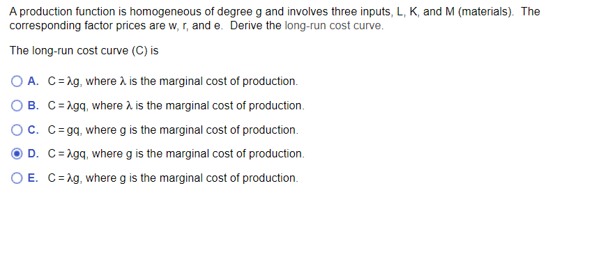 Solved A production function is homogeneous of degree g and | Chegg.com
