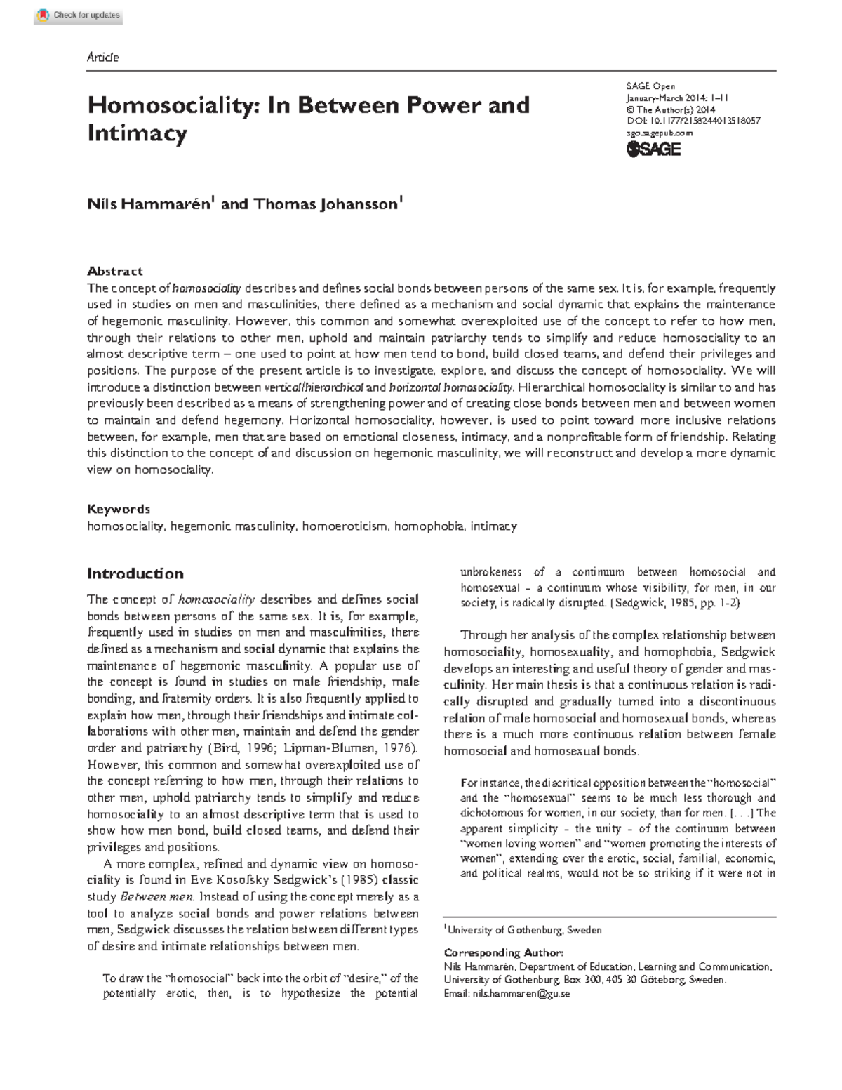 Homosociality In Between - SAGE Open January-March 2014: 1 – © The ...