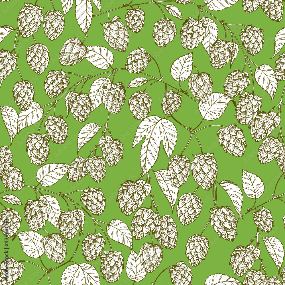 Hop vector seamless pattern. Hand drawn artistic beer green hops with ...