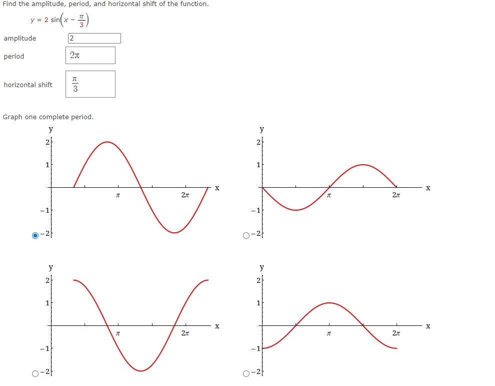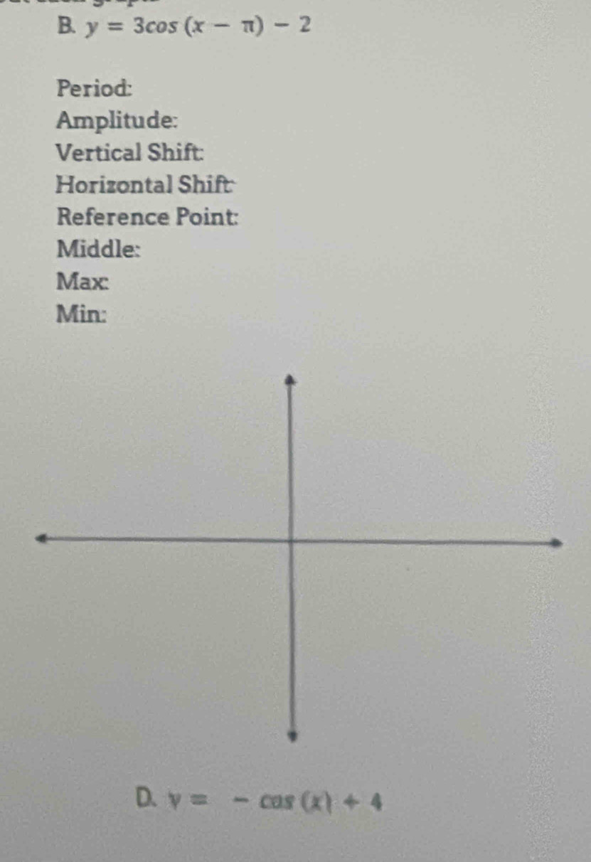 Solved: y=3cos (x-π )-2 Period: Amplitude: Vertical Shift: Horizontal ...