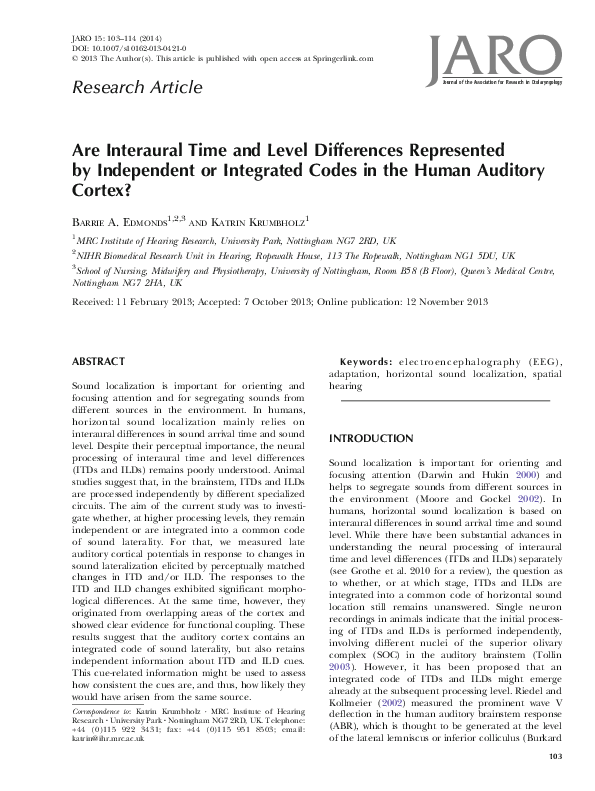 (PDF) Are Interaural Time and Level Differences Represented by ...