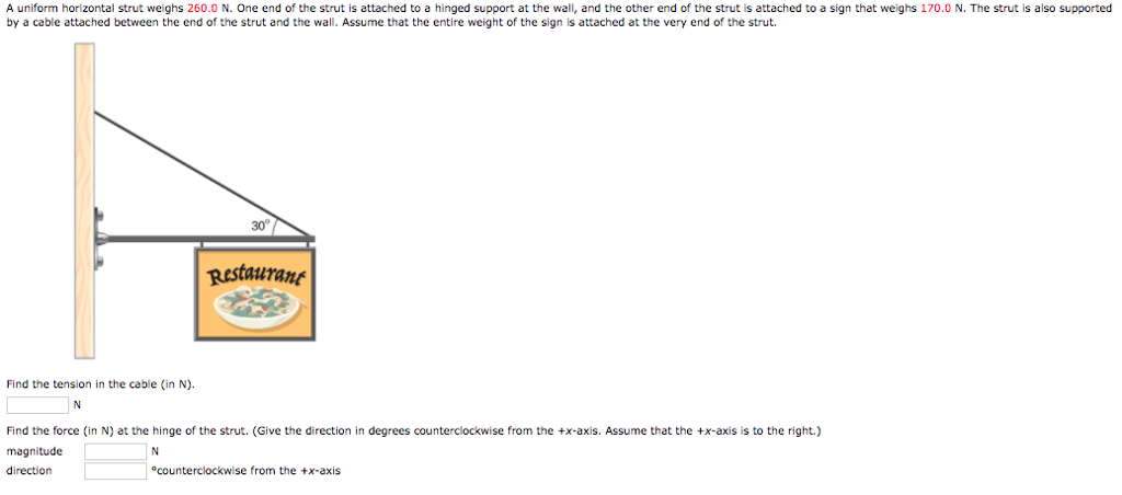 Solved A uniform horizontal strut weighs 260.0 N. One end of | Chegg.com