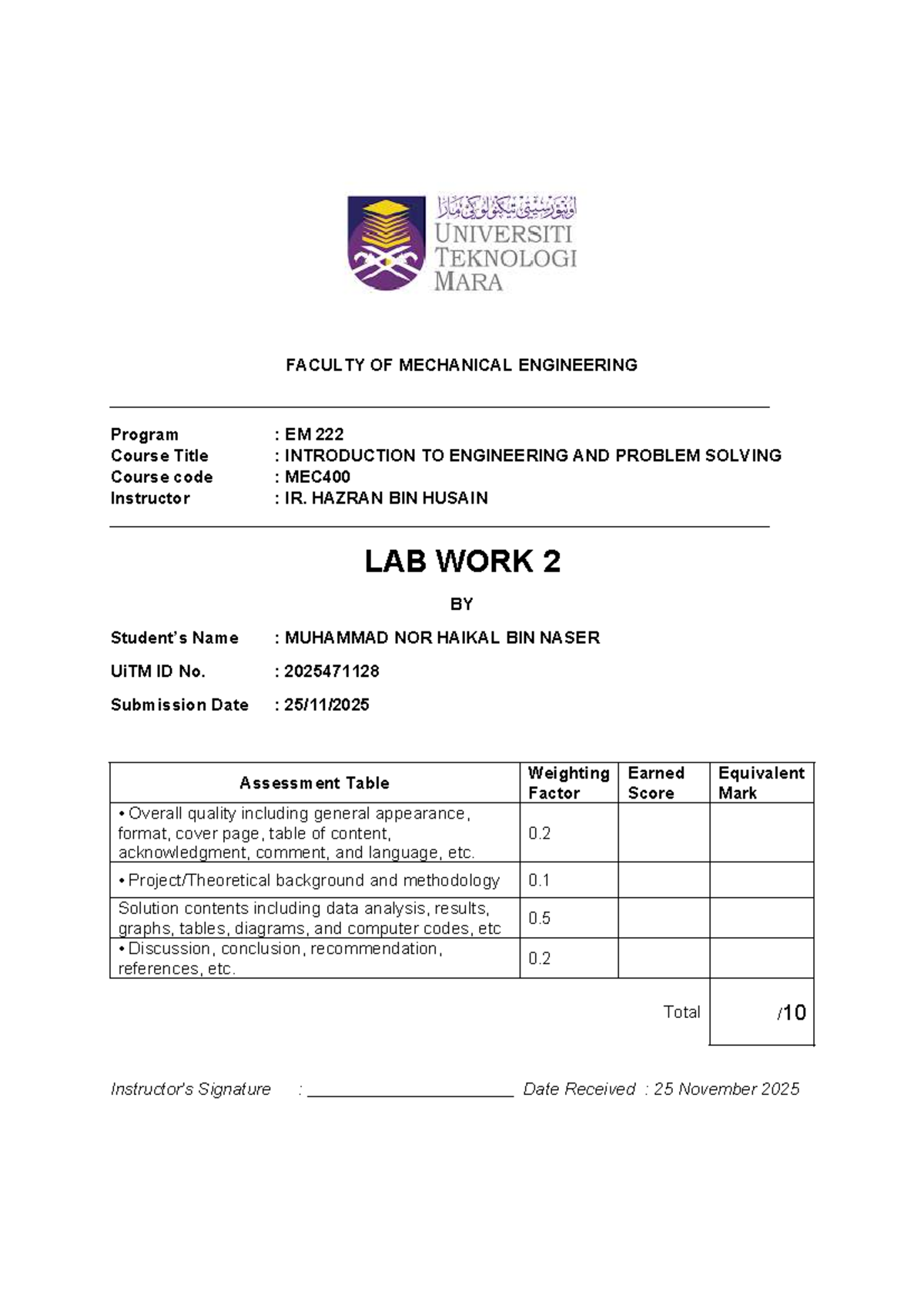 MEC400: Lab Work 2 - Introduction to Engineering & Problem Solving ...