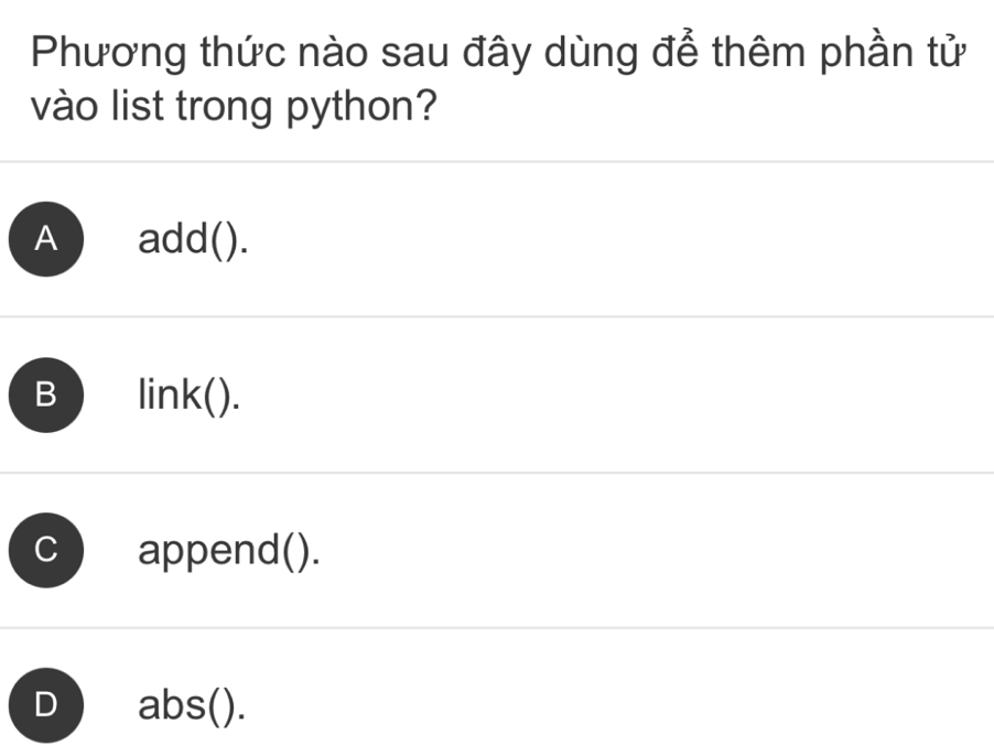 Giải quyết:Phương thức nào sau đây dùng để thêm phần tử vào list trong ...