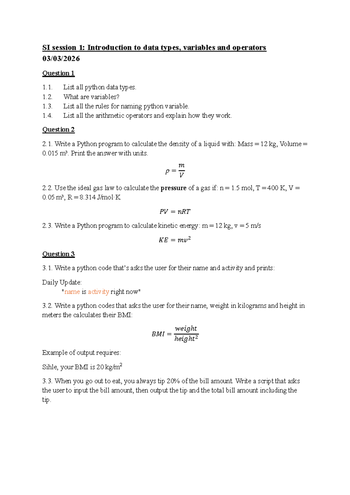 SI Session 1: Intro to Python Data Types & Programming Questions - Studocu