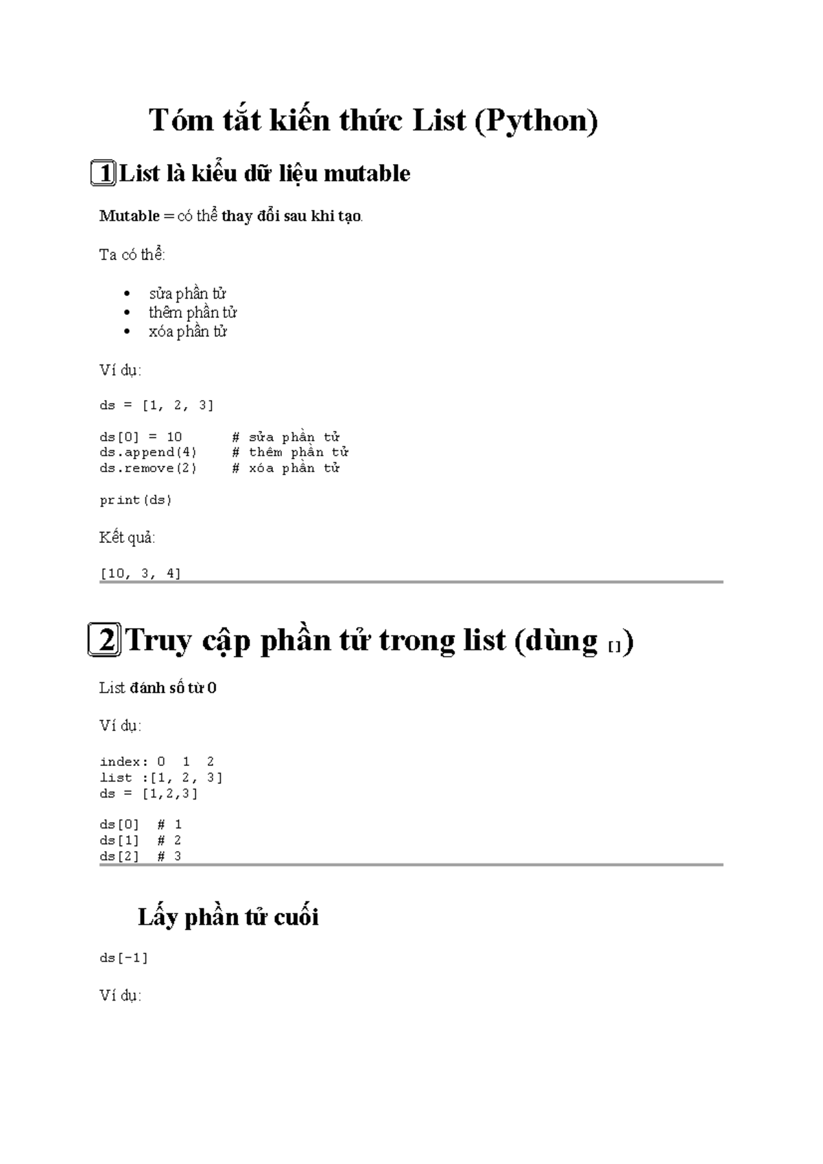 Tóm tắt kiến thức List (Python) - Các lệnh cơ bản và ví dụ - Studocu