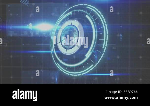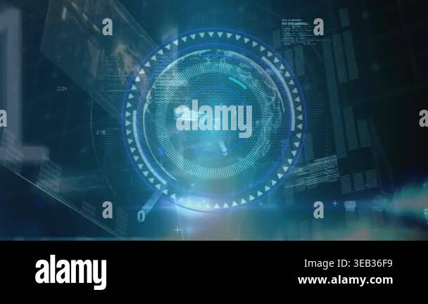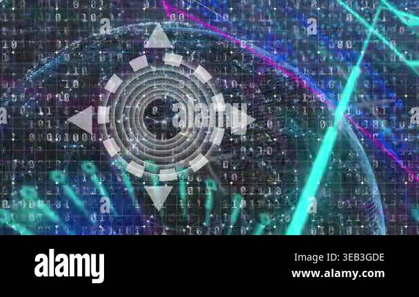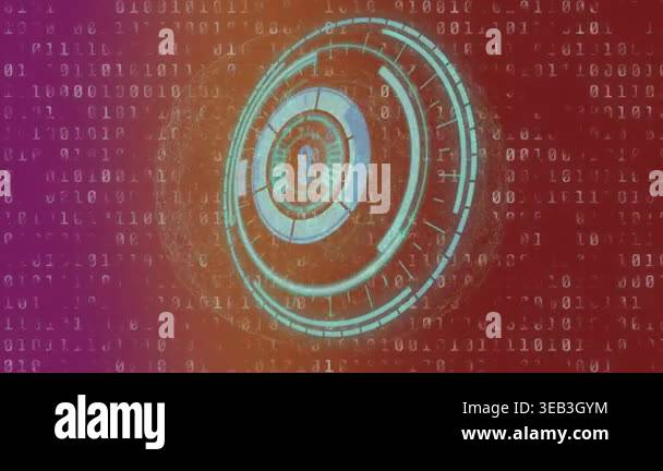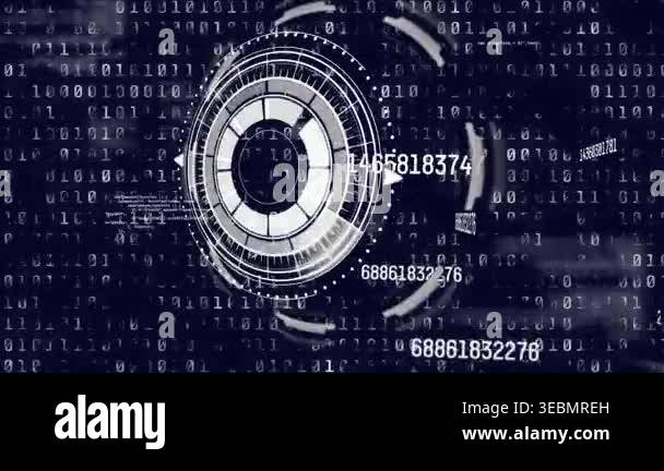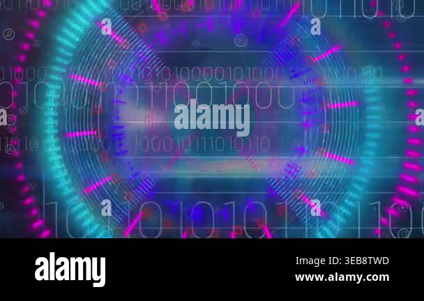Animation of circles and binary code on navy background. global network ...