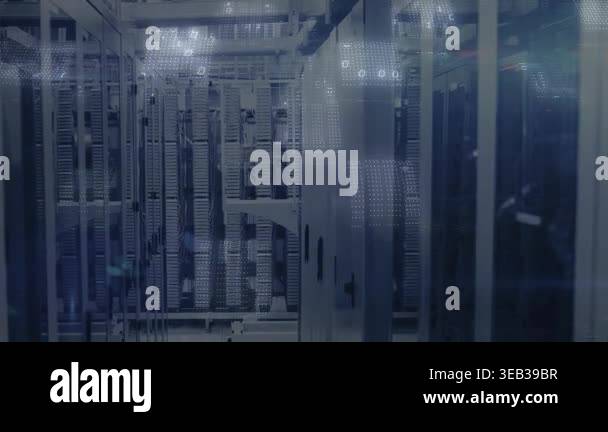 Animation of binary coding over server room. global business and ...